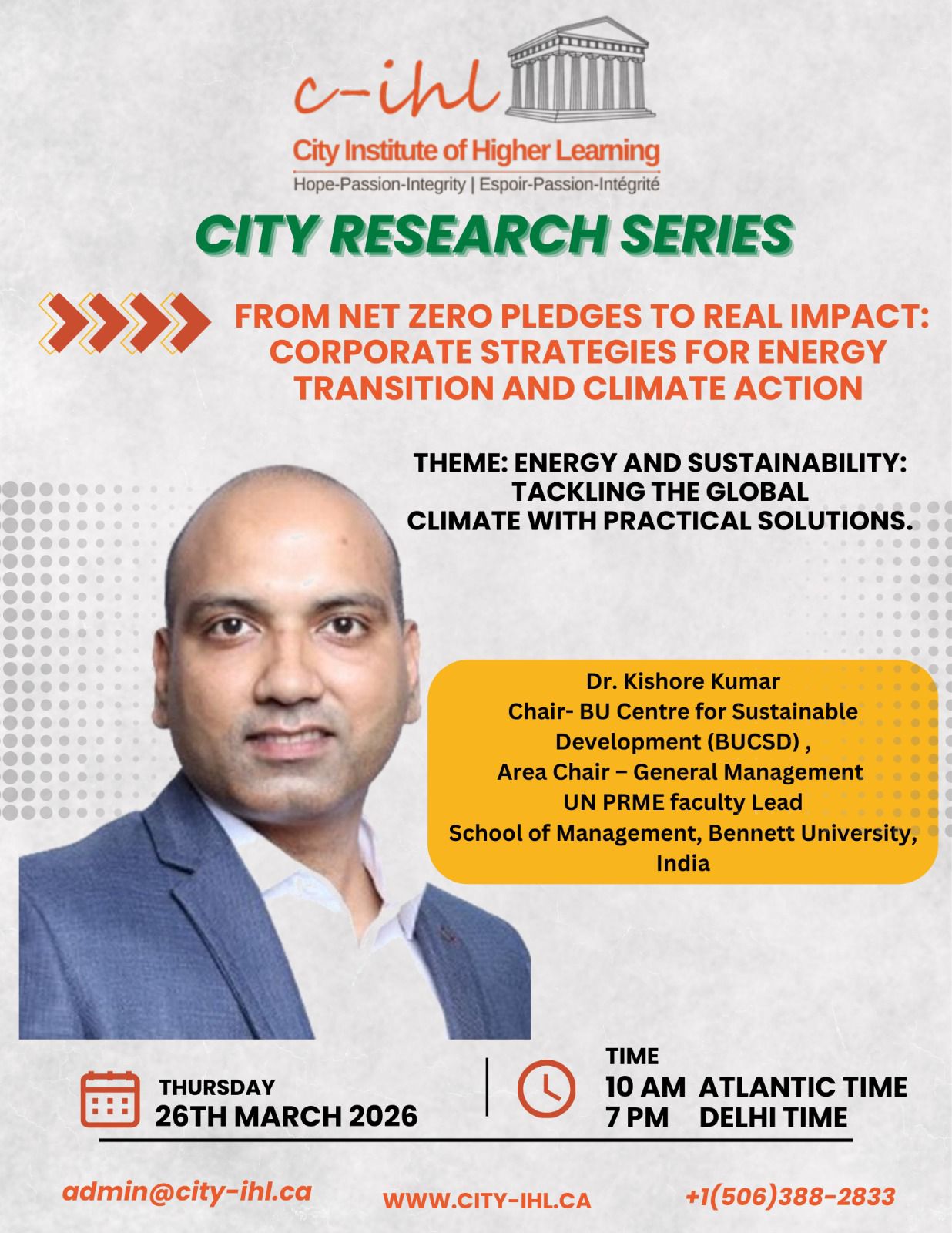 The City Institute of Higher Learning (C-IHL) invites you to the next edition of the City Research Series, featuring an insightful session on energy transition and corporate climate responsibility. Topic: From Net Zero Pledges to Real Impact: Corporate Strategies for Energy Transition and Climate Action Theme: Energy and Sustainability - Tackling the Global Climate with Practical Solutions Speaker: Dr. Kishore Kumar | Chair, BU Centre for Sustainable Development (BUCSD) | Area Chair – General Management | UN PRME Faculty Lead, School of Management, Bennett University, India For more information, visit: https://city-ihl.ca