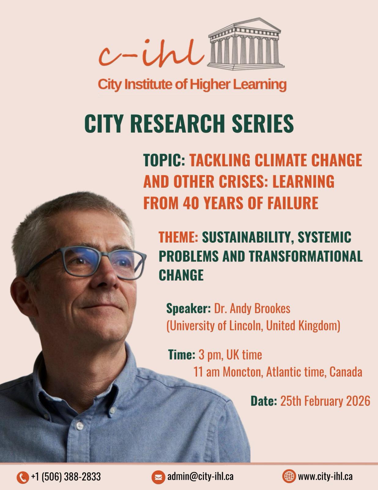 The Climate Change Atlantic Canada research series brings together experts and learners to explore urgent global challenges and practical solutions. This session will take place on February 25, 2026, and is hosted by the City Institute of Higher Learning. It offers a valuable opportunity to understand climate issues from both global and regional perspectives. This Climate Change Atlantic Canada event focuses on the topic of tackling climate change and other crises by learning from the past forty years. It highlights key lessons and examines why many strategies have failed over time. As a result, participants will gain a clearer understanding of what must change moving forward. In addition, the session explores sustainability, systemic problems, and the need for transformational change in modern societies. Dr. Andy Brookes from the University of Lincoln in the United Kingdom will lead the discussion. He brings academic insight and practical experience to the topic. During the session, he will explain complex ideas in a clear and engaging way. Therefore, participants will find it easier to connect theory with real-world applications. The event will begin at 3 pm UK time, which corresponds to 11 am in Moncton, Atlantic Canada. This timing allows both local and international participants to join conveniently. Moreover, the session creates a space for discussion, learning, and exchange of ideas among attendees from different backgrounds. This research series is ideal for students, researchers, professionals, and anyone interested in climate change and sustainability. It also suits individuals who want to understand systemic challenges and explore long-term solutions. Because of this, the event offers both academic value and practical insight. By attending, participants will expand their knowledge and gain new perspectives on climate change. They will also understand how past failures can guide future success. For more information, visit the official website: https://city-ihl.ca. To learn more about the speaker’s institution, you can also visit https://www.lincoln.ac.uk.