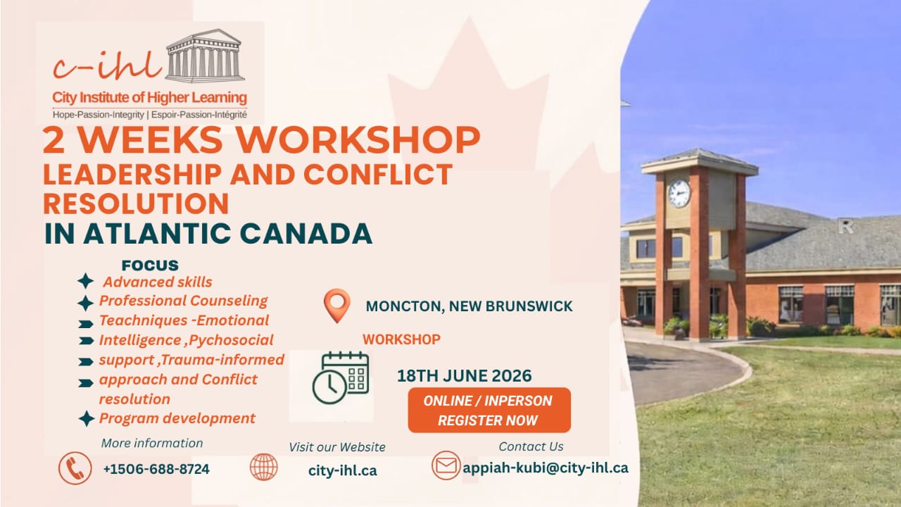 The Leadership and Conflict Resolution Workshop in Atlantic Canada 2026 is a two-week training program that builds strong leadership and conflict resolution skills. It starts on June 18, 2026, in Moncton, New Brunswick. Participants can join either online or attend in person, which makes the program accessible to a wider audience. The Leadership and Conflict Resolution Workshop in Atlantic Canada helps participants develop practical skills for real-life situations. First, it focuses on leadership growth through emotional intelligence and clear communication. In addition, it introduces professional counseling techniques and psychosocial support methods. As a result, participants learn how to handle sensitive situations with confidence. The training also includes trauma-informed approaches, which are essential in modern workplaces and communities. Moreover, the workshop helps participants understand how to manage conflicts in a structured and professional way. They learn how to reduce tension, improve teamwork, and build stronger relationships. At the same time, the program introduces basic program development skills. Because of this, participants can design simple initiatives that support growth in their organizations or communities. This workshop is ideal for professionals, students, educators, and NGO workers. It is also suitable for anyone who wants to improve leadership and communication skills. Whether you join online or in person, you will benefit from a diverse and interactive learning environment. By the end of the program, participants will feel more confident in their leadership roles. They will also gain practical tools to resolve conflicts effectively. Therefore, The Leadership and Conflict Resolution Workshop in Atlantic Canada offers a valuable opportunity for personal and professional growth. For more information, visit the official website: https://city-ihl.ca. To secure your spot, complete your registration here: Register Now